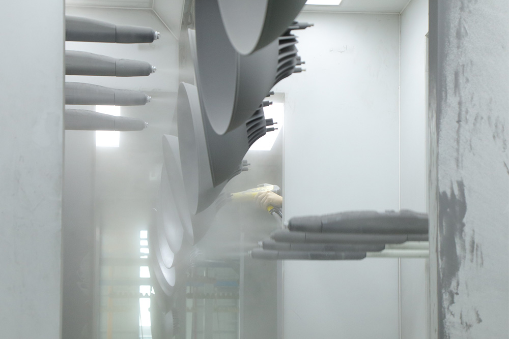 喷粉室是粉末静电涂装的主要设备之一。在操作中,要控制喷房内的粉尘含量,使其低于爆炸极限(一般定为10g/m³)。喷粉室要利于清洗,使粉末不易在屋中沉积,以便于改变粉末的颜色,室内要有足够的光线,以利于涂覆工作进行。
